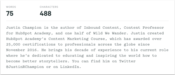 For example, I chose to include that I’m the creator of HubSpot Academy’s Content Marketing Certification Course, which at the time had awarded over 25,000 certifications to professionals across the globe. This is something that can help me build credibility with my audience if they don’t know who I am yet.