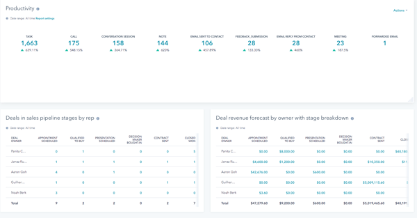 With HubSpot Sales, you can create customizable sales reports and dashboards to provide reps with visibility into their activity metrics and how those efforts are contributing to deal progression and pipeline generation.