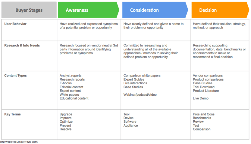 One of the hardest parts of blogging is defining the topics that you need to cover. Start by defining the behavior, needs and key terms that your buyer personas will be addressing in each stage of the buyer's journey. Persona Mad Libs can be a great way to help get the creative juices flowing for keyword and topic ideation. Here's an example of what this might look like: