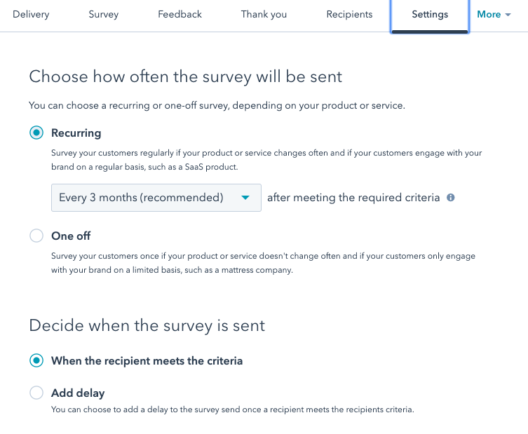 HubSpot allows you to either send the survey to every contact with a “became a customer” date of more than 30 days ago or create your own custom criteria.